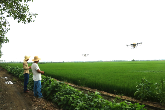 ▲皖河农场用无人机为“千亩方”田进行病虫害防治