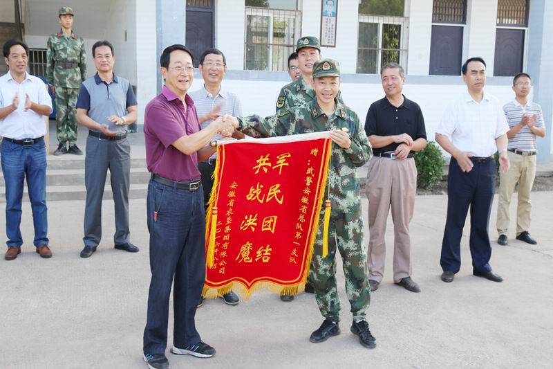 12日上午,刘超、李家堂一行到华阳河五场慰问和送别武警安徽总队第一支队官兵,并代表安徽农垦集团向该支队赠送了锦旗。在欢送仪式上,刘超说,在华阳河农场130公里的大堤上,在华阳湖堤顶多处出现险情的危急时刻,有一支英雄的部队,武警安徽总队第一支队的官兵们冲在了防汛抗洪抢险的前线,你们用武警的军装和青春,展现出一不怕苦、二不怕死的战斗精神,在华阳河农场筑起了防汛抗洪的坚强长城。岁月如梭,转眼你们又要奔赴新的战场,在此,我代表安徽农垦集团及今天到场的同志、华阳河农场全体干群向你们致以崇高的敬意和衷心的感谢!同时预祝你们在新的征程中不断成长,让我们的军民鱼水情万古长青!